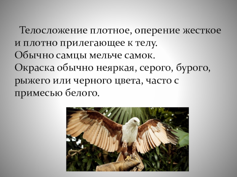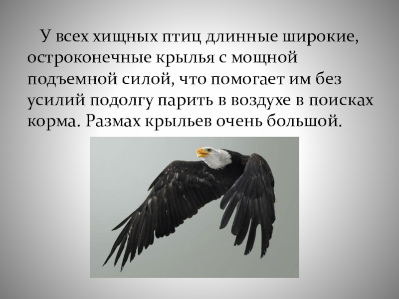 Слайд 8 У всех хищных птиц длинные широкие, остроконечные крылья с