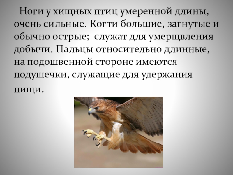 Слайд 10 Ноги у хищных птиц умеренной длины, очень сильные. Когти большие,