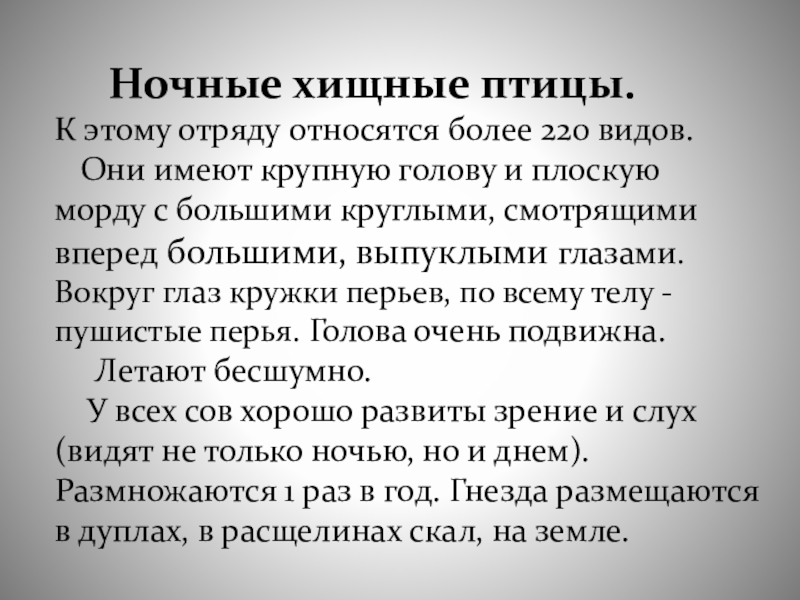 У всех сов хорошо развиты зрение и слух (видят не только ночью, но и днем). Размножаются 1 раз в год. Гнезда размещаются в дуплах, в расщелинах скал, на земле.