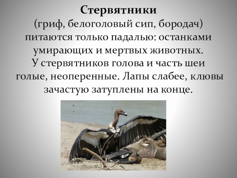У стервятников голова и часть шеи голые, неоперенные. Лапы слабее, клювы зачастую затуплены на конце.