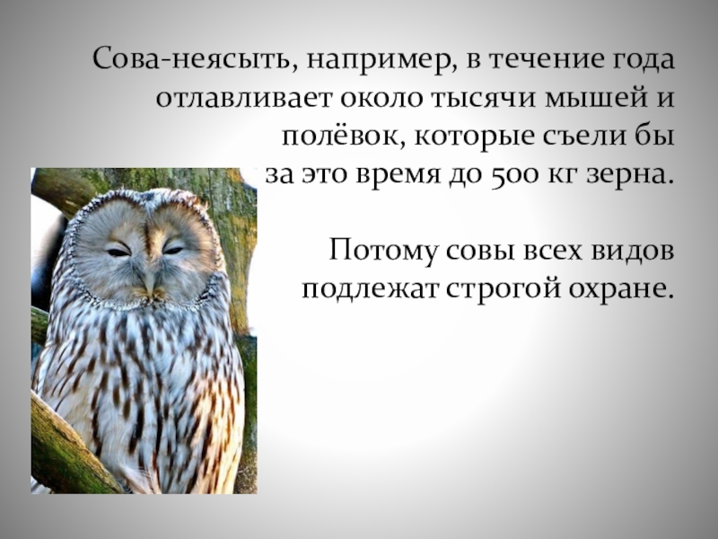 Слайд 23Сова-неясыть, например, в течение года отлавливает около тысячи мышей и