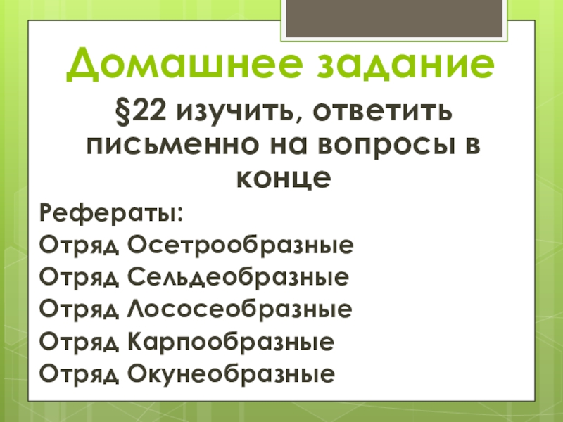 Домашнее задание§22 изучить, ответить письменно на вопросы в конце Рефераты:Отряд ОсетрообразныеОтряд СельдеобразныеОтряд ЛососеобразныеОтряд КарпообразныеОтряд Окунеобразные
