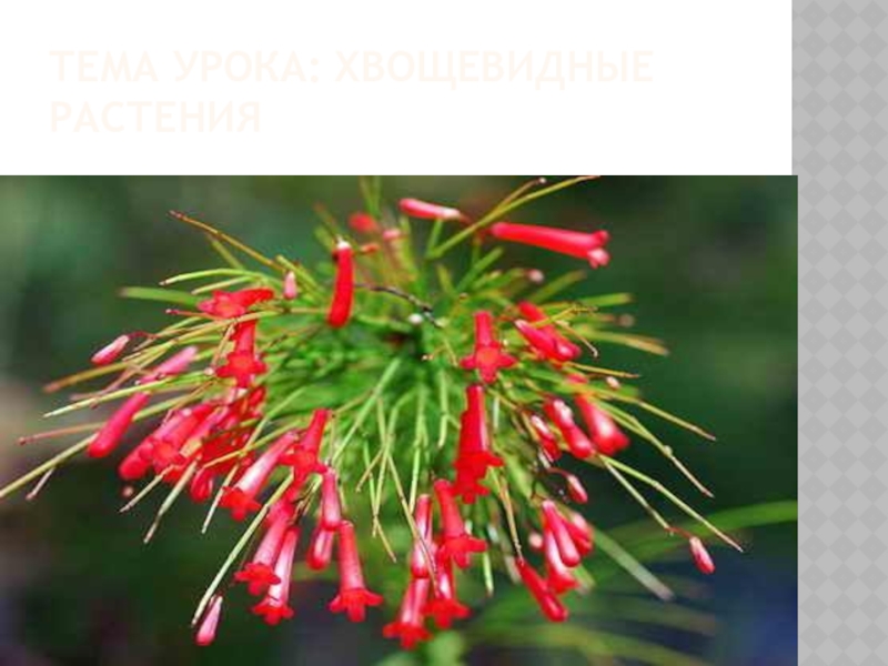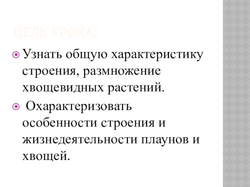 Цель урока:Узнать общую характеристику строения, размножение хвощевидных растений. Охарактеризовать особенности строения и жизнедеятельности плаунов и хвощей.