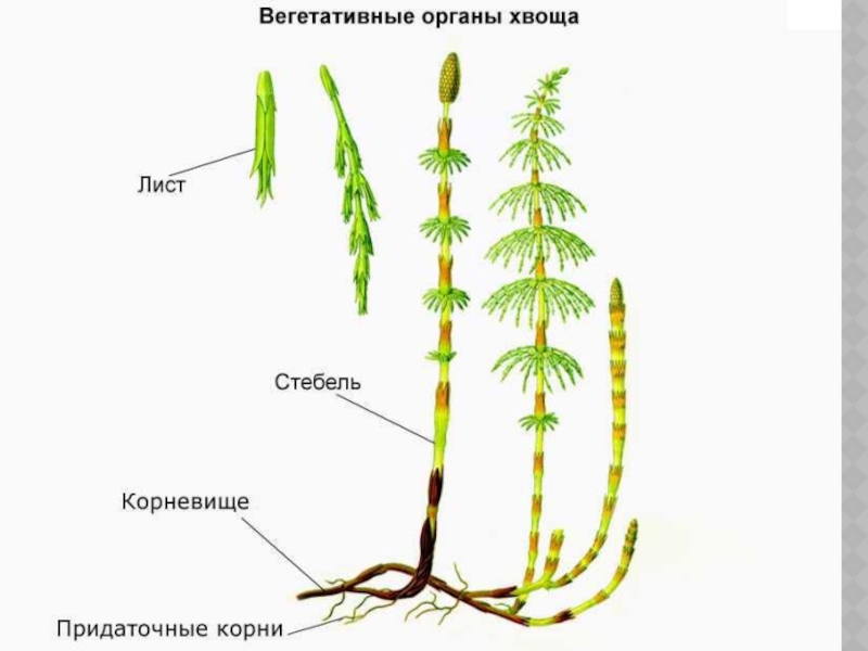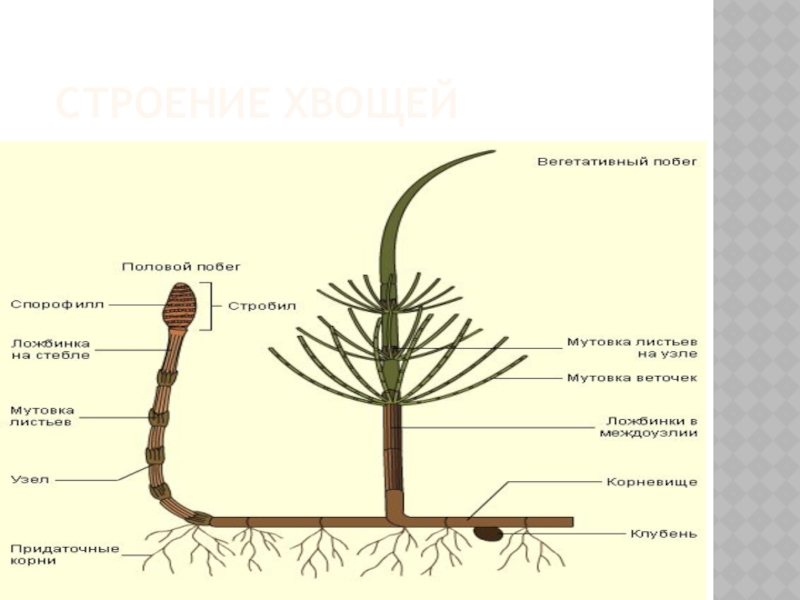 точно характеризует особенности их строения. Побеги хвощевидных состоят из четко оформленных стеблей с междоузлиями и узлами с мутовчато расположенными на них мелкими чешуевидными листьями.