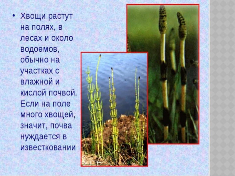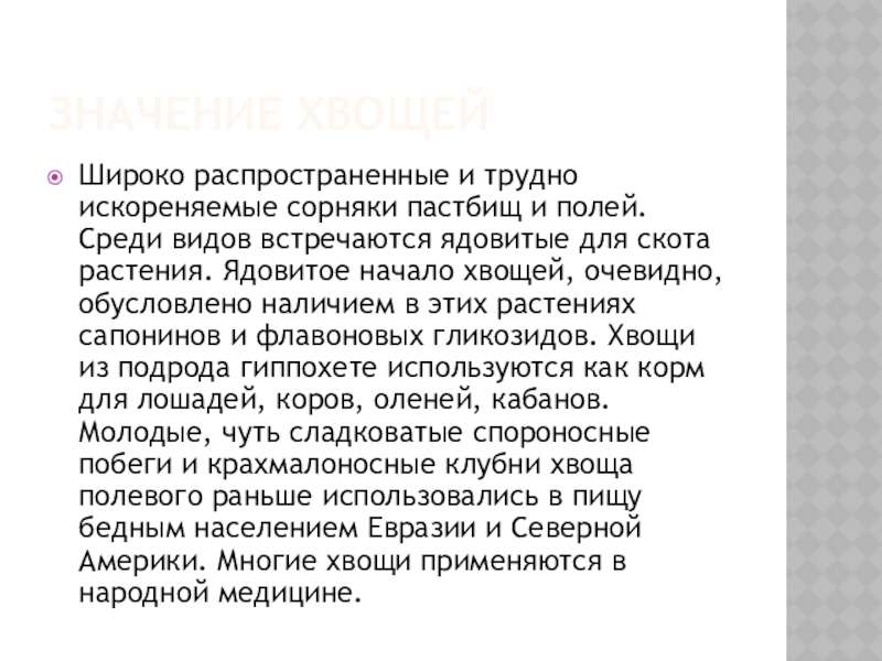 Значение хвощейШироко распространенные и трудно искореняемые сорняки пастбищ и полей. Среди видов встречаются ядовитые для скота растения.