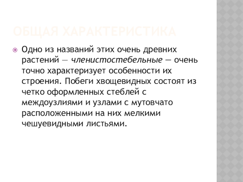 Общая характеристика Одно из названий этих очень древних растений — членистостебельные — очень точно характеризует особенности их строения. Побеги