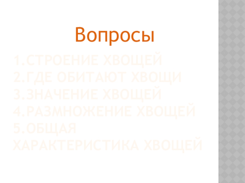 1.Строение хвощей 2.Где обитают хвощи 3.Значение хвощей 4.Размножение хвощей 5.Общая характеристика хвощейВопросы