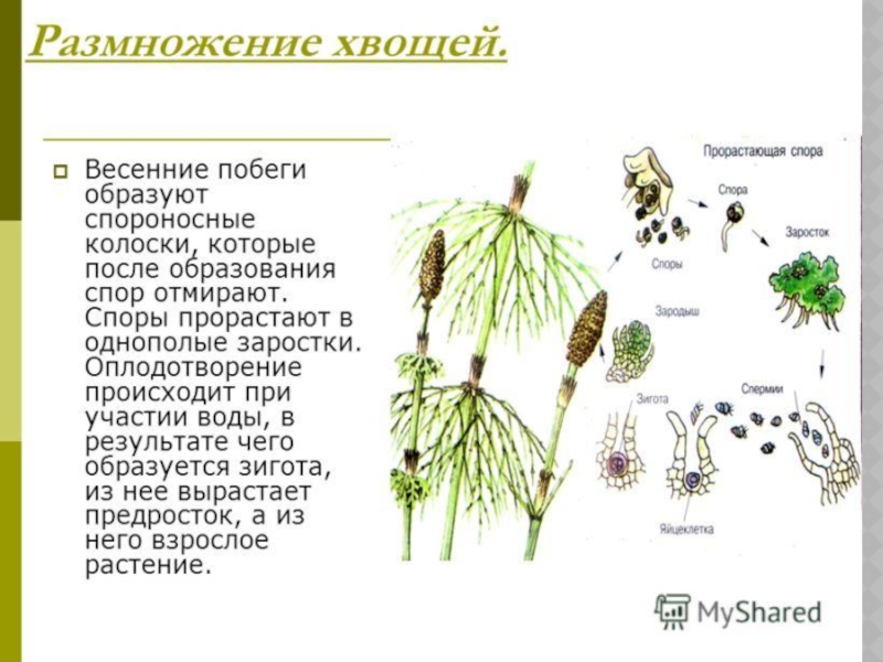 Узнать общую характеристику строения, размножение хвощевидных растений.