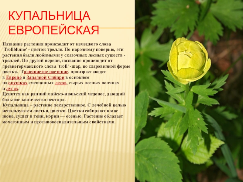 Название растения происходит от немецкого слова 'Trollblume' - цветок тролля.