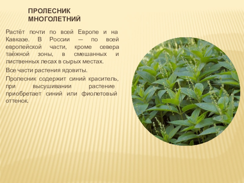 Пролесник содержит синий краситель, при высушивании растение приобретает синий или фиолетовый оттенок.