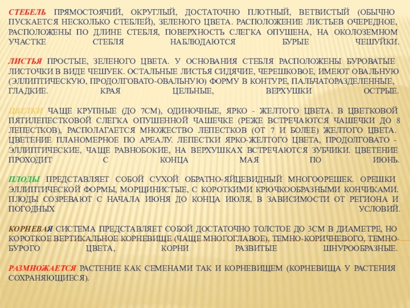 Слайд 18Стебель прямостоячий, округлый, достаточно плотный, ветвистый (обычно пускается несколько стеблей), зеленого