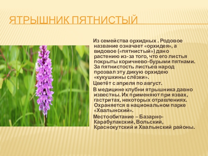 («пятнистый») дано растению из-за того, что его листья покрыты коричнево-бурыми пятнами. За пятнистость листьев народ прозвал эту дикую орхидею «кукушкины слёзки».