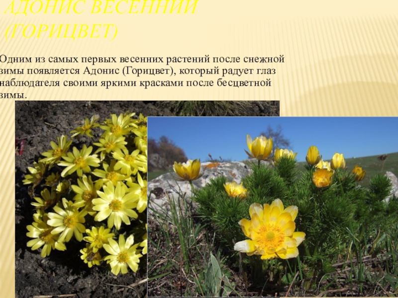 появляется Адонис (Горицвет), который радует глаз наблюдателя своими яркими красками после бесцветной зимы.