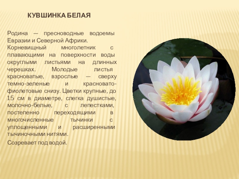 плавающими на поверхности воды округлыми листьями на длинных черешках. Молодые листья красноватые, взрослые — сверху темно-зеленые и красновато-фиолетовые снизу. Цветки крупные, до 15 см в диаметре, слегка душистые, молочно-белые, с лепестками, постепенно переходящими в многочисленные тычинки с уплощенными и расширенными тычиночными нитями.