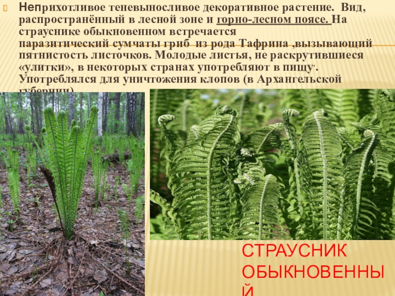 страуснике обыкновенном встречается паразитический сумчаты гриб из рода Тафрина ,вызывающий пятнистость листочков. Молодые листья, не раскрутившиеся «улитки», в некоторых странах употребляют в пищу.. Употреблялся для уничтожения клопов (в Архангельской губернии).