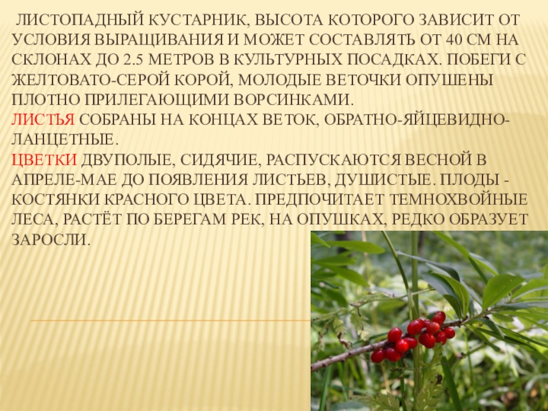 может составлять от 40 см на склонах до 2.5 метров в культурных посадках. Побеги с желтовато-серой корой, молодые веточки опушены плотно прилегающими ворсинками. Листья собраны на концах веток, обратно-яйцевидно-ланцетные. Цветки двуполые, сидячие, распускаются весной в апреле-мае до появления листьев, душистые. Плоды - костянки красного цвета. Предпочитает темнохвойные леса, растёт по берегам рек, на опушках, редко образует заросли.