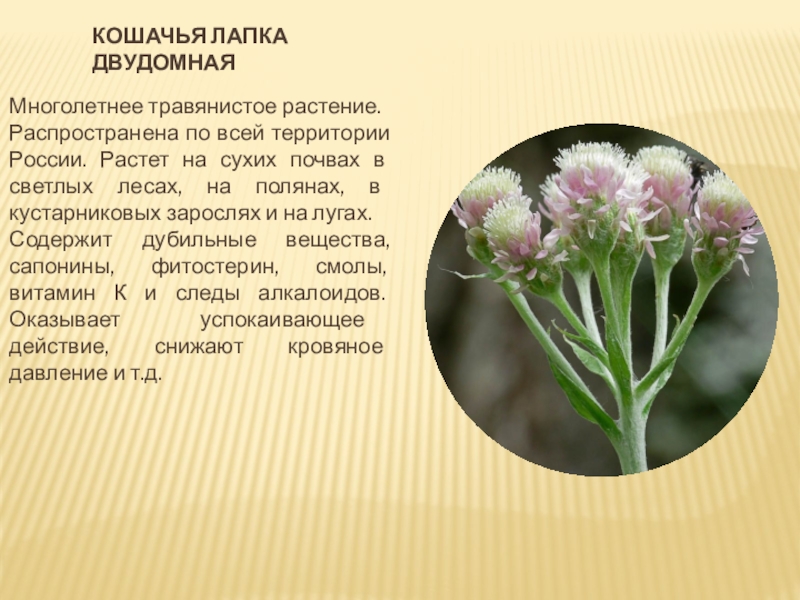 Содержит дубильные вещества, сапонины, фитостерин, смолы, витамин К и следы алкалоидов. Оказывает успокаивающее действие, снижают кровяное давление и т.д.