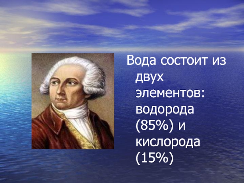 Слайд 15Вода состоит из двух элементов: водорода (85%) и кислорода (15%)