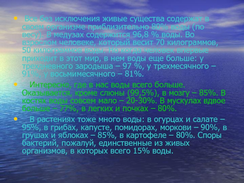 Все без исключения живые существа содержат в своем организме приблизительно 80% воды (по весу). В медузах