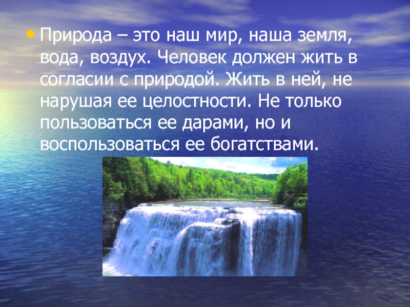 Природа – это наш мир, наша земля, вода, воздух. Человек должен жить в согласии с природой. Жить