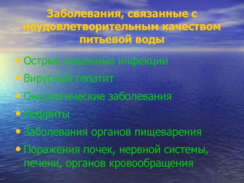 Заболевания, связанные с неудовлетворительным качеством питьевой водыОстрые кишечные инфекцииВирусный гепатитОнкологические заболеванияНефритыЗаболевания органов пищеваренияПоражения почек, нервной системы, печени,