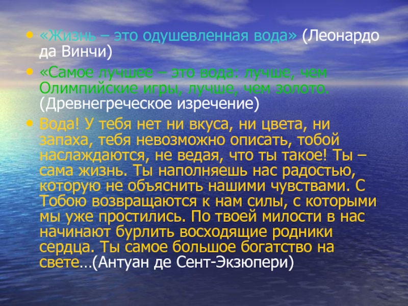 «Жизнь – это одушевленная вода» (Леонардо да Винчи)«Самое лучшее – это вода: лучше, чем Олимпийские игры, лучше,