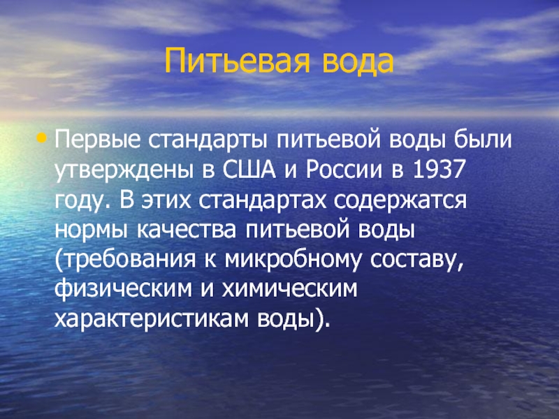 в 1937 году. В этих стандартах содержатся нормы качества питьевой воды (требования к микробному составу, физическим и химическим характеристикам воды).