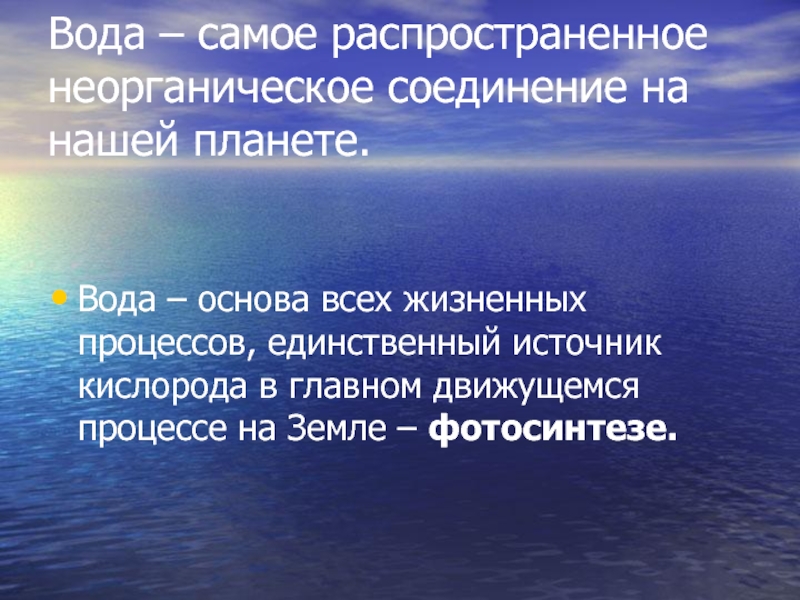 Слайд 3Вода – самое распространенное неорганическое соединение на нашей планете.