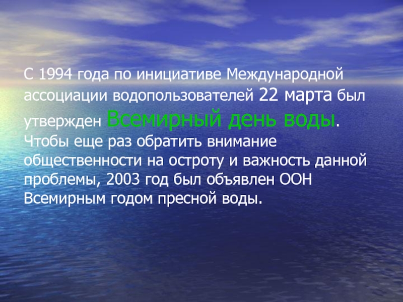 Слайд 6С 1994 года по инициативе Международной ассоциации водопользователей 22 марта был