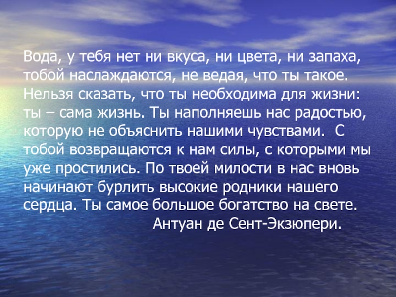 Слайд 2Вода, у тебя нет ни вкуса, ни цвета, ни запаха, тобой