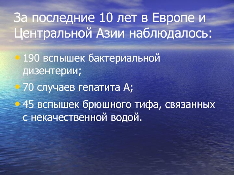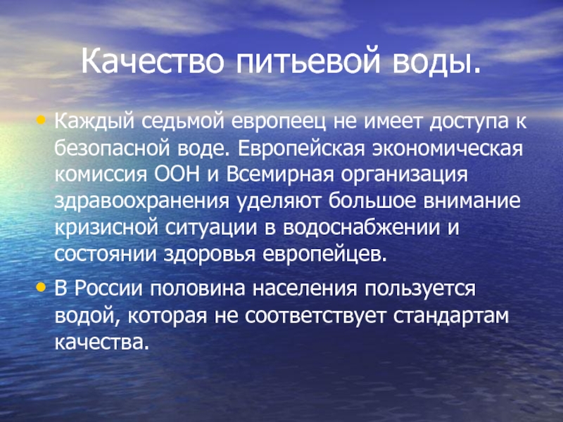 Европейская экономическая комиссия ООН и Всемирная организация здравоохранения уделяют большое внимание кризисной ситуации в водоснабжении и состоянии здоровья европейцев.