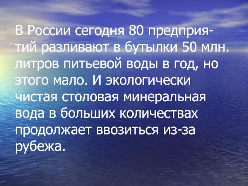 питьевой воды в год, но этого мало. И экологически чистая столовая минеральная вода в больших количествах продолжает ввозиться из-за рубежа.