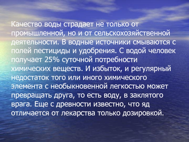деятельности. В водные источники смываются с полей пестициды и удобрения. С водой человек получает 25% суточной потребности химических веществ. И избыток, и регулярный недостаток того или иного химического элемента с необыкновенной легкостью может превращать друга, то есть воду, в заклятого врага. Еще с древности известно, что яд отличается от лекарства только дозировкой.