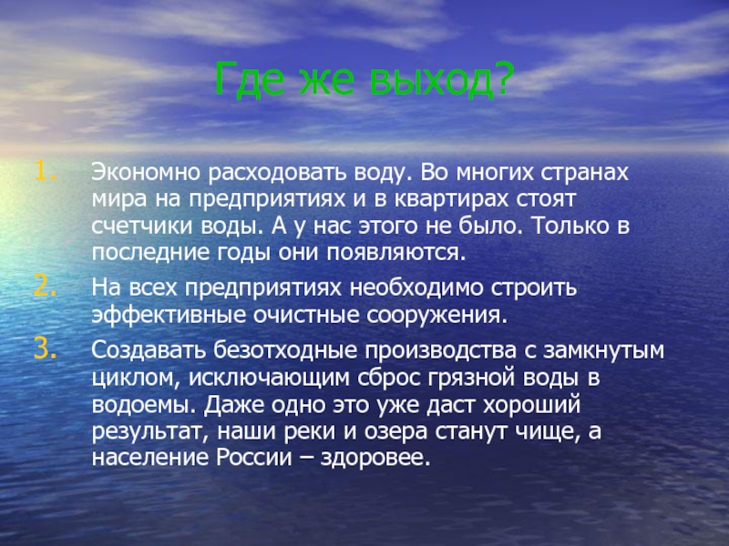 Создавать безотходные производства с замкнутым циклом, исключающим сброс грязной воды в водоемы. Даже одно это уже даст хороший результат, наши реки и озера станут чище, а население России – здоровее.