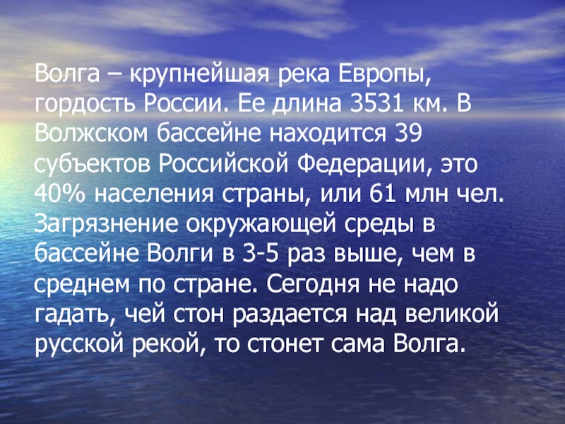 В Волжском бассейне находится 39 субъектов Российской Федерации, это 40% населения страны, или 61 млн чел. Загрязнение окружающей среды в бассейне Волги в 3-5 раз выше, чем в среднем по стране. Сегодня не надо гадать, чей стон раздается над великой русской рекой, то стонет сама Волга.