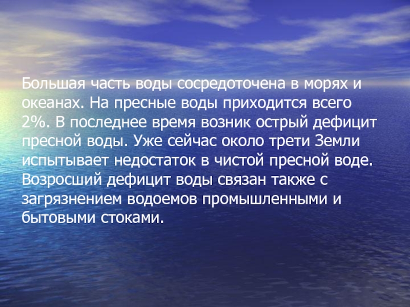 приходится всего 2%. В последнее время возник острый дефицит пресной воды. Уже сейчас около трети Земли испытывает недостаток в чистой пресной воде. Возросший дефицит воды связан также с загрязнением водоемов промышленными и бытовыми стоками.