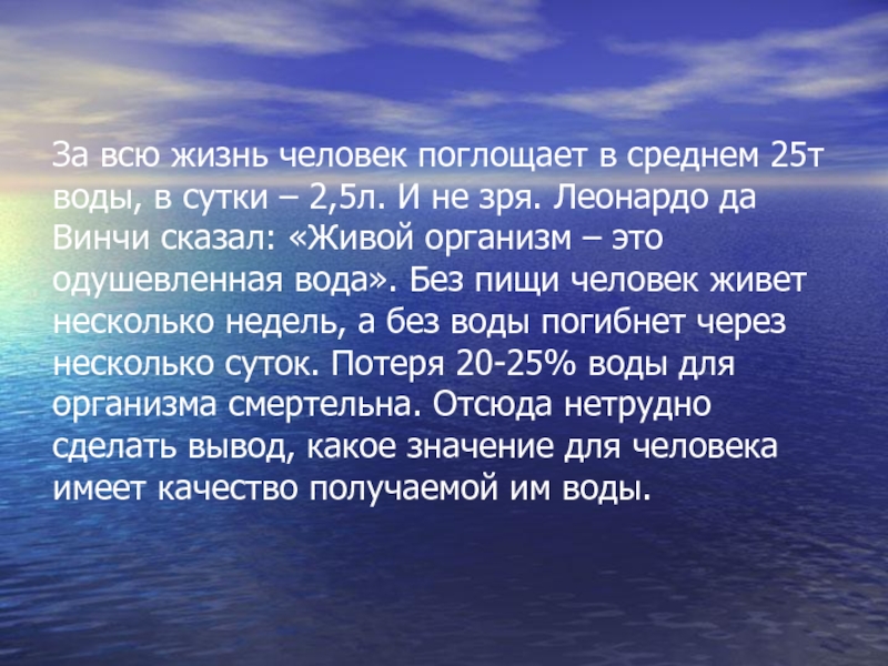 – 2,5л. И не зря. Леонардо да Винчи сказал: «Живой организм – это одушевленная вода». Без пищи человек живет несколько недель, а без воды погибнет через несколько суток. Потеря 20-25% воды для организма смертельна. Отсюда нетрудно сделать вывод, какое значение для человека имеет качество получаемой им воды.