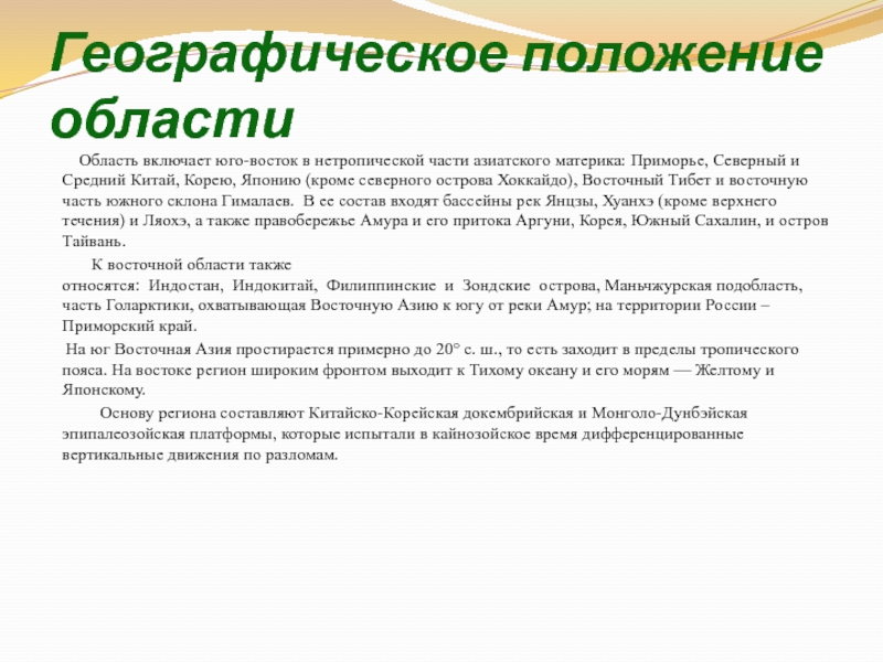 На юг Восточная Азия простирается примерно до 20° с. ш., то есть заходит в пределы тропического пояса. На востоке регион широким фронтом выходит к Тихому океану и его морям — Желтому и Японскому.
