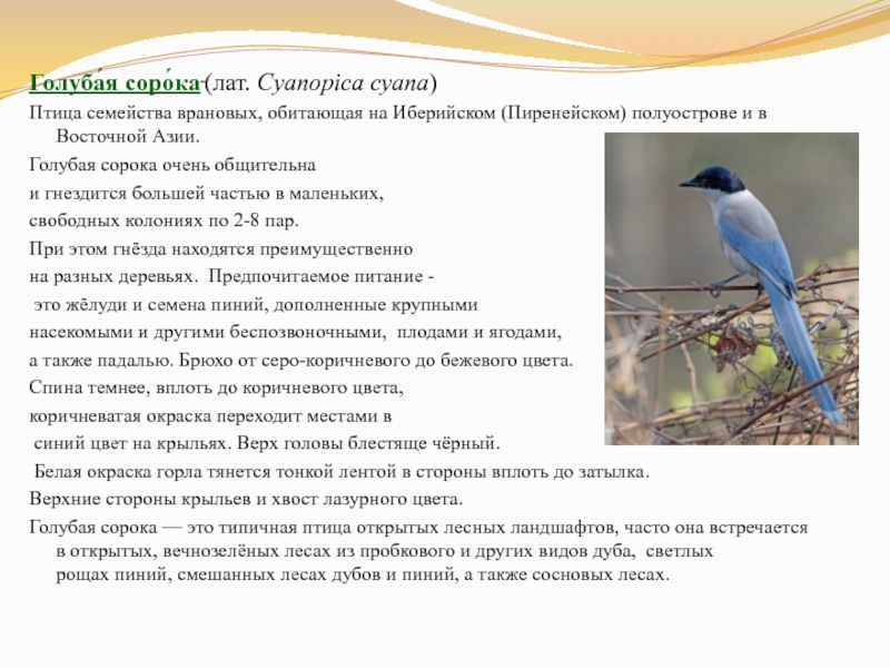 Слайд 24Голуба́я соро́ка (лат. Cyanopica cyana)