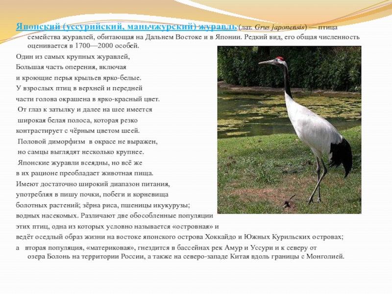 Слайд 10Японский (уссурийский, маньчжурский) журавль (лат. Grus japonensis) — птица семейства журавлей, обитающая на Дальнем Востоке и