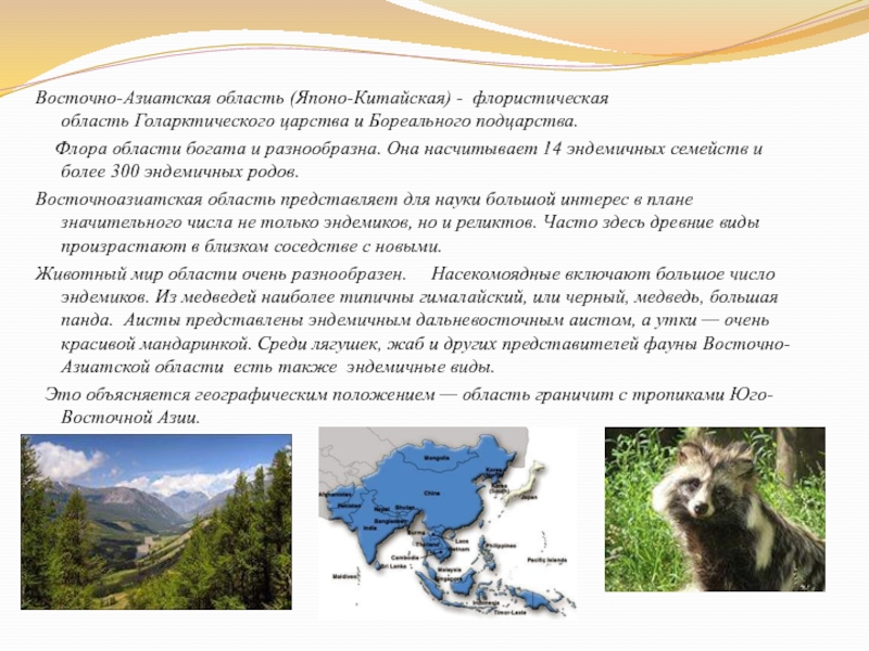 Слайд 27Восточно-Азиатская область (Японо-Китайская) - флористическая область Голарктического царства и Бореального подцарства.