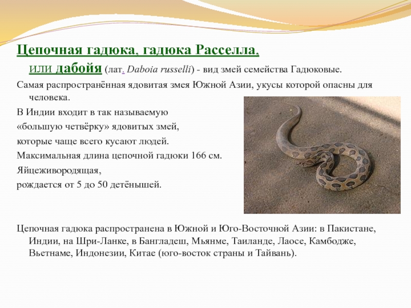 Слайд 25Цепочная гадюка, гадюка Расселла, или дабойя (лат. Daboia russelli) - вид змей семейства Гадюковые.