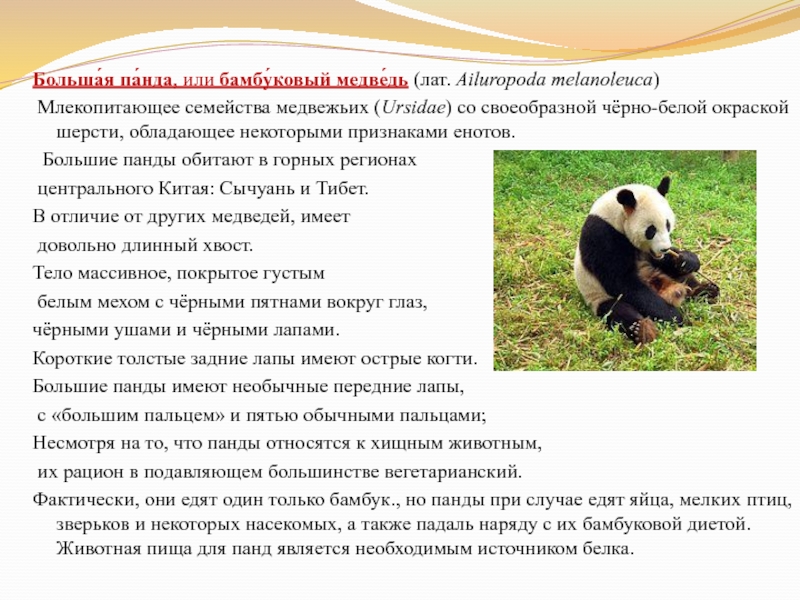 Слайд 20Больша́я па́нда, или бамбу́ковый медве́дь (лат. Ailuropoda melanoleuca)