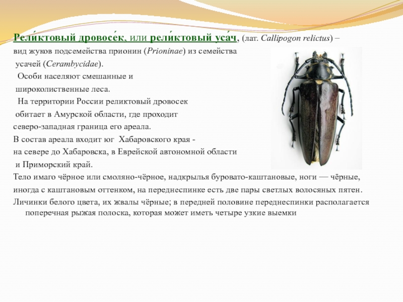 Слайд 26Рели́ктовый дровосе́к, или рели́ктовый уса́ч, (лат. Callipogon relictus) –