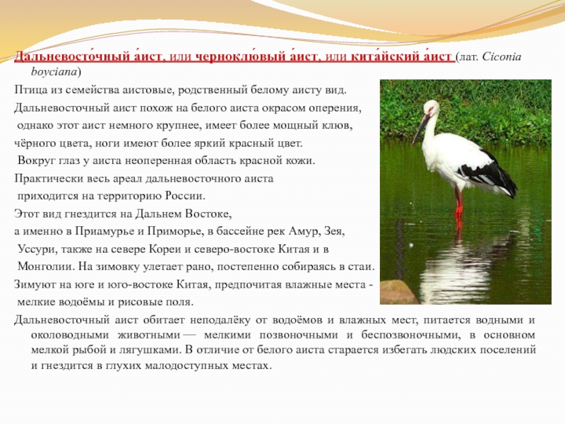 Слайд 21Дальневосто́чный а́ист, или черноклю́вый а́ист, или кита́йский а́ист (лат. Ciconia boyciana)