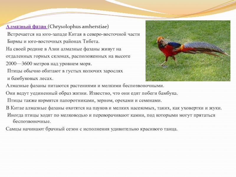 Слайд 9Алмазный фазан (Chrysolophus amherstiae)