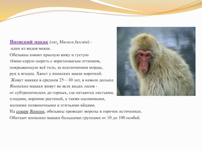 Слайд 6Японский макак (лат. Macaca fuscata) -