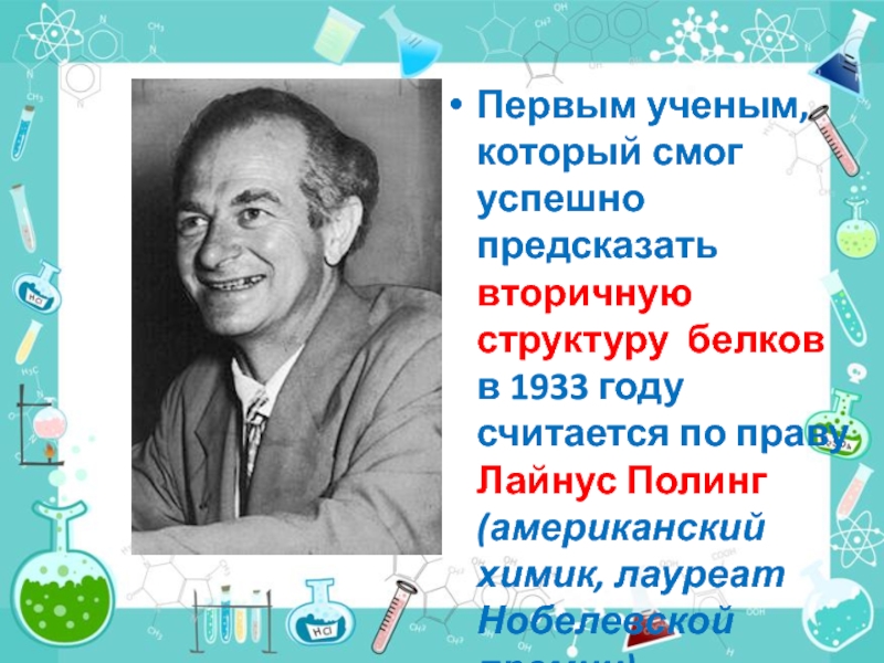 Слайд 13Первым ученым, который смог успешно предсказать вторичную структуру белков в 1933