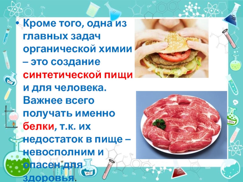 Слайд 18Кроме того, одна из главных задач органической химии – это создание