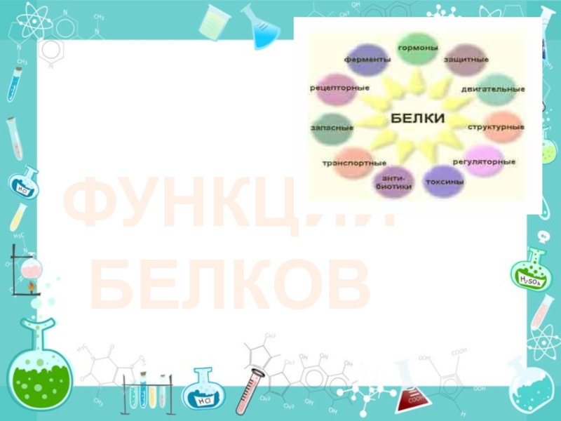 Функции белков: строительная, каталитическая, транспортная, защитная, двигательная, энергетическая, регуляторная.